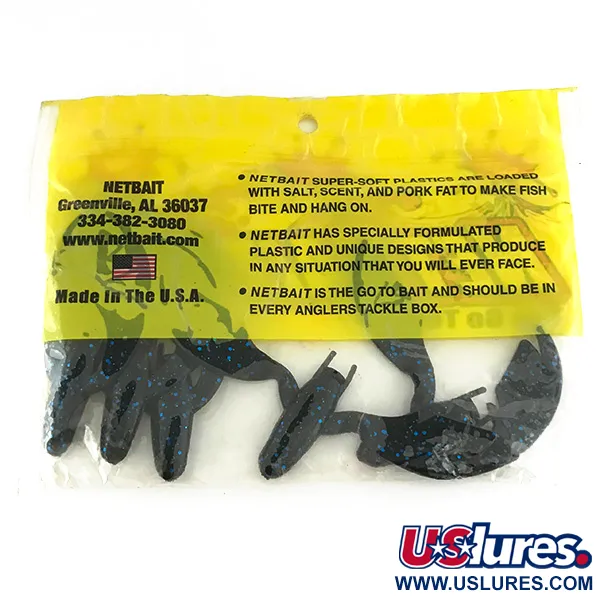 Blaue Glitterflocken heben sich vom tiefschwarzen Körper dieser in den USA hergestellten Gummiköder ab. Mit einer Länge von 3" (7,5 cm) bieten diese NetBait Paca Chunk Sr. Köder (Artikelnummer 6956) ein massives Profil für die Verwendung als Jig-Trailer. Dieses Exemplar ist unbenutzt und in der originalen gelb akzentuierten Verpackung erhalten. Die Marke weist auf eine spezielle Formel mit Lockstoff, Salz und Schweinefett hin, die Angler als Markenzeichen von NetBait kennen. Mit breiten, flachen Scheren und einem Hohlkörper-Design sind diese Köder in der klassischen Farbe Black Blue mit 5 Stück pro Packung erhältlich.