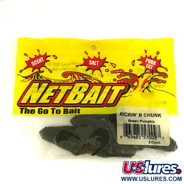 Green Pumpkin mit schwarzen Flakes charakterisiert diese 7,5 cm langen Gummiköder. Diese in Greenville, Alabama, hergestellten NetBait Kickin B Chunks sind ein Standard für Jig-Trailer-Anwendungen und verfügen über einen stark gerippten Körper sowie zwei sichelförmige Schwanzelemente. Diese Packung mit der Artikelnummer 6836 ist unbenutzt und enthält die originale Aroma- und Salzformel des Herstellers. Das Design umfasst zwei kleinere innere Zangen zwischen den Hauptschwänzen, die für das Flipping und Pitching in dichtem Bewuchs gedacht sind. Wie auf der gelben Verpackung angegeben, nutzen diese Köder eine Mischung aus Salz, Aroma und Schweineschmalz für eine spezifische Textur. Jeder Köder in der Packung ist sauber und gut erhalten.