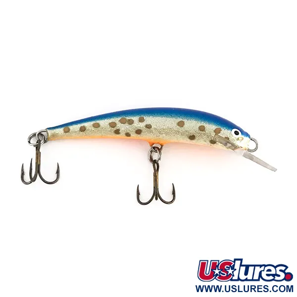 Dieser handgefertigte Holzwobbler aus Finnland stammt aus der legendären Nils Master Invincible Floating-Serie mit dem Produktcode 9226. Das Dekor Light Blue Trout zeichnet sich durch einen leuchtend blauen Rücken aus, der in schimmernde, gold-silberne Flanken mit markanten braunen Punkten und einen zart-orangefarbenen Bauch übergeht. Mit einem Gewicht von 8 g (1/4 oz) und einer Länge von 8 cm (3 1/4") besticht das Design durch breite Flanken und ein von oben betrachtet leicht abgeflachtes Profil. Die Kunsthandwerker von Finlandia Uistin haben diesen lautlosen Köder sowohl zum Werfen als auch zum Schleppfischen entwickelt, wobei er Lauftiefen von bis zu 2 m (6,5 ft) erreicht. Zur Ausstattung gehören zwei scharfe Drillinge an stabilen Sprengringen. Dieses Exemplar befindet sich in einem exzellenten Zustand (Bewertung 5/5) und verkörpert die erstklassige finnische Handwerkskunst. Die klare Tauchschaufel ist fest fixiert, um Raubfische wie Forelle, Lachs und Hecht sicher zu haken.