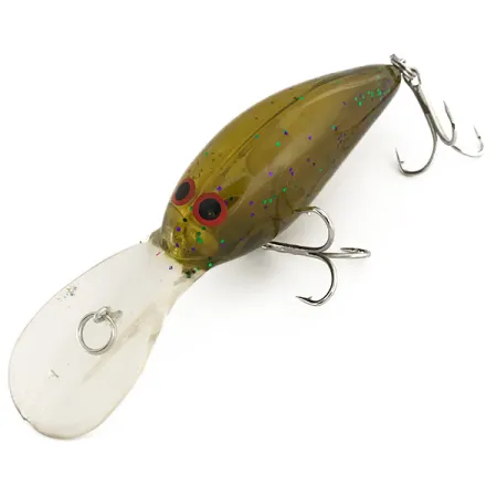 Im transparenten, olivfarbenen Körper dieses tieflaufenden Crankbaits sind lebhafte lila und grüne Glitter-Partikel eingeschlossen. Dieser Norman DD 14 mit dem Produktcode 7478 ist 7 cm (2 3/4") lang und wiegt 16 g (3/5 oz). Die Konstruktion beinhaltet eine interne Rassel für eine akustische Lockwirkung im Wasser sowie ein schwebendes Laufverhalten (Suspending) für variable Führungstechniken. Die große, klare Tauchschaufel ist darauf ausgelegt, Tiefen von 3,6 m bis 4,2 m (12 - 14 ft) zu erreichen, wodurch sich der Köder sowohl zum Werfen als auch zum Schleppen eignet. Am Kopf setzen markante rote Augen einen kontrastreichen Akzent zum olivfarbenen Finish. Die Hardware befindet sich in einem hervorragenden Zustand (Bewertung 5/5) und umfasst die originalen Sprengringe und Drillinge. Dieses in den USA hergestellte Modell zeigt das klassische Norman-Profil mit seinem charakteristischen, glitzerdurchsetzten Kunststoff.