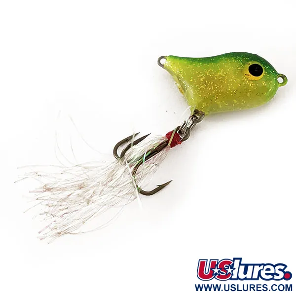 Mit silbernem Flash-Material und einer roten Garnwicklung am Drilling versehen, demonstriert dieses Exemplar die klassische Vielseitigkeit des Norman "Front Runner" Designs. Der 2,2g (1/16oz) leichte Körper besticht durch einen lebhaften gelb-grünen Farbverlauf, der stark mit feinem Goldglitzer akzentuiert ist, um das Licht effektiv einzufangen. Mit einer Länge von nur 3cm (1 1/4") wurde er als Oberflächen-Teaser entwickelt, der in-line vor einem größeren Walking Bait oder Popper montiert wird. Die übergroßen schwarzen Augen mit gelber Umrandung sind klar und zentriert und bieten ein markantes Ziel für Raubfischattacken. Dieser in den USA hergestellte Köder mit dem Produktcode 11599 befindet sich in einem hervorragenden 5/5-Zustand. Die Hardware ist glänzend und die Lackierung bewahrt den ursprünglichen Glanz des chartreusefarbenen Bauches und des dunkelgrünen Rückens.