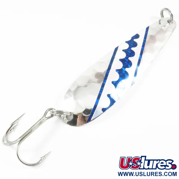 Dieser in Kanada hergestellte Schlepplöffel wiegt 1/2 Unze (14 g) und verfügt über eine Echtsilber-Beschichtung, die speziell für die Lichtreflexion in größeren Tiefen entwickelt wurde. Der Len Thompson Northern King 28 UV, katalogisiert unter dem Produktcode 3530, ist ein aus Messing gefertigter Trolling-Köder mit einer Länge von 9,5 cm (3 3/4"). Die bereits 1984 eingeführte Northern King-Serie nutzt die Silberplattierung, damit das Metall beim Absinken gut sichtbar bleibt. Dieses spezielle Modell weist eine gehämmerte Textur auf der Vorderseite auf, die mit einem blau-weißen Klebebandmuster versehen ist, das für UV-Reaktivität in tieferen Wasserschichten sorgt. Auf der Rückseite zeigt der Köder eine saubere, silberne Oberfläche mit Wabenprägung. Die Ausstattung umfasst einen robusten Drillingshaken an einem stabilen Sprengring, passend für das spezielle Trolling-Design. Im Zustand 5/5 bleibt die Silberbeschichtung glänzend und die UV-Akzente sind über die gesamte Länge des Körpers bestens erhalten.