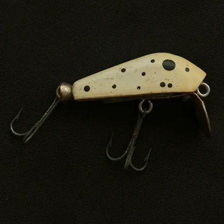 Deutlich in die Metall-Tauchschaufel eingeprägt ist das Markenzeichen des Herstellers, welches diese US-amerikanische Rarität als Paul Bunyan Dyna-mite unter der Artikelnummer 23512 ausweist. Mit einer Länge von nur 4,5 cm (1 3/4") besitzt der Köder einen kompakten, tropfenförmigen Körper, der speziell für zielgenaue Würfe entwickelt wurde. Das cremefarbene Dekor ist mit einer Reihe schwarzer Punkte versehen, einschließlich eines markanten Flecks im hinteren Bereich – ein typisches Designmerkmal für US-Angelgeräte aus der Mitte des 20. Jahrhunderts. Zwei scharfe Drillinge sind mit robusten Beschlägen montiert, einer am Bauch und einer am Schwanz. Mit einem Gewicht von 11 g (2/5 oz) verfügt der Köder über eine Dichte, die eine präzise Platzierung beim Anwerfen von Unterständen ermöglicht. Der Zustand dieses speziellen Exemplars wird mit 4/5 bewertet, da die Originallackierung und die markante Prägung auf der kreisrunden Schaufel gut lesbar und hervorragend erhalten sind.