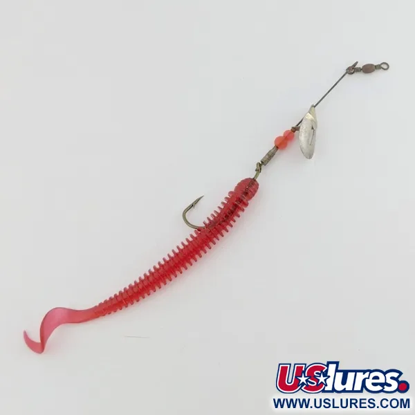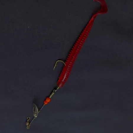 Die Vernickelung des Spinnerblatts dieses 6 g (3/16 oz) schweren Spinner-Rigs erzeugt ein dezentes Aufblitzen vor dem leuchtend roten Weichplastik-Schwanz. Mit einer Gesamtlänge von 10 cm verfügt der Pflueger June Bug №4 über den charakteristischen Offset-Arm, der dafür sorgt, dass das Blatt frei von der Hauptachse rotiert. Zwei rote Perlen auf dem Draht setzen Farbakzente und unterstützen die Balance der Montage. Das Rig ist mit einem Einzelhaken bestückt, auf dem ein gerippter Twister sitzt, der das optische Profil deutlich vergrößert. Bei einer Zustandsbewertung von 4/5 haben der Metalldraht und die Komponenten ihre strukturelle Integrität über die Zeit bewahrt. Dieses spezielle Modell mit der Artikelnummer 24501 ist ein Klassiker unter den Multi-Material-Rigs, die einen Metall-Locklöffel mit einem Soft-Trailer kombinieren.