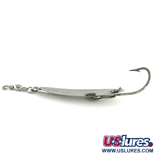 Auf der vernickelten Oberfläche ist deutlich die Prägung „PFLUEGER RECORD MADE IN AKRON, O. U.S.A. 5“ eingestempelt, was diesen Löffel fest in seinen historischen Wurzeln in Ohio verankert. Dieser 2/3 oz (20 g) schwere Löffel misst 3 1/4" (8 cm) und bewahrt den hellen, reflektierenden Glanz, der typisch für die Pflueger-Handwerkskunst aus der Mitte des Jahrhunderts ist. Mit einem Zustand von 4/5 weist das Metall dezente Zeitspuren auf, behält jedoch ein sauberes, gut erhaltenes Finish. Die Konstruktion verfügt über ein spezielles Krautschutz-Design mit einem Drahtbügel, der den großen Einzelhaken beim Fischen in dichtem Bewuchs schützt. Dieses Modell mit dem Produktcode 7116 wurde für vielseitige Einsätze entwickelt und funktioniert je nach Bedarf des Anglers sowohl als Standardlöffel als auch als Krautlöffel. Ein robuster Tonnwirbel ist an der Spitze angebracht, um den Schnurdrall beim Einholen zu verhindern. Das Gewicht und das ovale Profil sind optimal für weite Würfe in Vegetationslücken ausbalanciert.