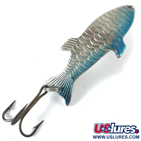 Vernickelung kombiniert mit einem lebhaften blauen Farbverlauf prägt die Ästhetik dieses 3/16oz (5,5g) Metallblinkers. Mit einer Länge von 1 3/4" (4,5cm) weist der Körper tief geprägte Schuppen und eine anatomische Fischform auf, inklusive Rücken- und Brustflossen, die zu seinen einzigartigen hydrodynamischen Eigenschaften beitragen. Auf der Rückseite des Köders ist der Markenname PHOEBE deutlich eingestempelt, ein Markenzeichen für die US-amerikanische Qualität von Acme. Dieses Exemplar mit der Artikelnummer 3687 erzeugt unter Wasser eine dreidimensionale Illusion, was es sowohl für das Tiefsee-Jiggen als auch für das Flachwasser-Werfen effektiv macht. Das Finish bleibt glänzend und der Drillingshaken ist sicher befestigt, was diesem Modell eine Zustandsbewertung von 5/5 einbringt. Sein Design ermöglicht Vielseitigkeit bei verschiedenen Einholgeschwindigkeiten, vom schnellen Einkurbeln bis hin zu einer stetigen, rhythmischen Präsentation.