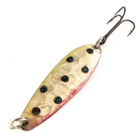 Die Hammerschlag-Wabenstruktur erzeugt eine komplexe Reflexion auf der versilberten Oberfläche dieses Pirate Lures Blinkers, ein hochwertiger Köder, der in den USA gefertigt wurde. Mit einer Länge von 6,5 cm (2 1/2") und einem Gewicht von 12 g (2/5 oz) ist der Pirate Joe's Silver Plated perfekt für einen vielseitigen Einsatz ausbalanciert. Das Dekor besticht durch einen hellen grün-gelben Farbton am Rücken und einen rosa-roten Schimmer am Bauch, ergänzt durch sieben glitzernde schwarze Punkte, die kontrastreiche Zielpunkte auf der silbernen Basis bilden. Die Rückseite hebt die glänzende Versilberung und die Tiefe des geprägten Schuppenmusters hervor. Ausgestattet mit originalen Sprengringen und einem scharfen Drilling befindet sich dieses Modell mit dem Code 12483 in einem Zustand von 5/5. Das Silberfinish ist weiterhin glänzend und unterstreicht die Handwerkskunst klassischer Pirate Lures Designs, die speziell für das Spinnfischen und Schleppangeln entwickelt wurden.