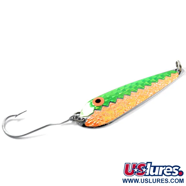 Fluoreszierendes Grün und strukturiertes Orange treffen in einem scharfen, gezackten Muster auf der Vorderseite dieses in den USA hergestellten Schlepplöffels aufeinander. Auf der polierten Silberrückseite ist der Markenname Pro King deutlich eingestempelt, was seine Herkunft aus der Fischerei der Großen Seen unterstreicht. Mit einem Gewicht von 12,5 g (2/5 oz) ist der Körper für eine effektive Wasserverdrängung beim Schleppfischen geformt. Mit einer Länge von 9,5 cm (3 3/4") ist der Köder mit einem großen Einzelhaken und Edelstahl-Sprengringen ausgestattet. Er trägt die Artikelnummer 1851 und das Finish ist in einem 5/5-Zustand erhalten. Die wabenartige Textur auf der orangenen Hälfte sorgt für einen kontrastreichen Flash-Effekt gegenüber dem giftgrünen oberen Teil – eine klassische Farbkombination für gute Sichtbarkeit in tiefen Gewässerschichten.