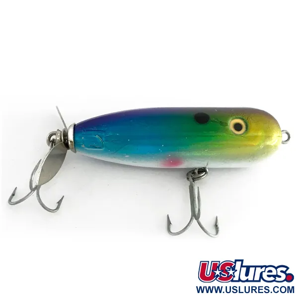 Leuchtende Regenbogenfarben prägen das Dekor dieses 6,5 cm (2 1/2") langen Oberflächenköders. Die Farbgebung verläuft von Goldgelb an der Nase über sattes Grün und Blau bis hin zu einem tiefen Violett auf dem Rücken. Dieses Modell der Marke Producers mit dem Produktcode 8297 ist ein klassischer Topwater-Köder aus amerikanischer Fertigung, der für maximale Oberflächenunruhe entwickelt wurde. Ein am Heck montierter Edelstahl-Propeller wirbelt das Wasser auf, während eine interne Rasselkammer beim Einholen für einen rhythmischen Klang sorgt. Das schlanke, glatte Körperprofil ist mit zwei scharfen Drillingshaken an stabilen Schraubösen ausgestattet. Hinter dem Kopf befindet sich ein markanter schwarzer Punkt, und auf dem weißen Bauch ist ein kleiner pinkfarbener Bisspunkt sichtbar. Die gelb lackierten Augen mit dunklen Pupillen verleihen der verjüngten Nase ein traditionelles Aussehen. Mit einem Zustand von 5/5 ist dieser Köder bemerkenswert sauber, mit kräftigen Farben und glänzenden Metallkomponenten. Mit einem Gewicht von 9,5 g (1/3 oz) bietet er die nötige Masse für präzise Würfe auf ufernahe Raubfische.