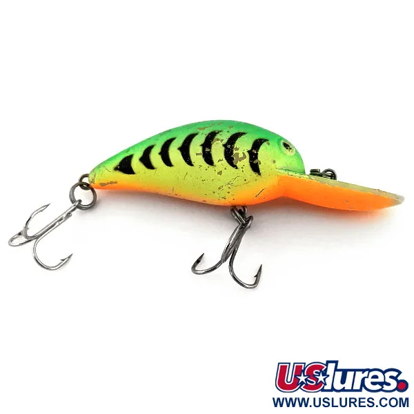 Mit seinem auffälligen Fire Tiger-Farbmuster ist dieser klassische, in den USA hergestellte Wobbler sowohl für das Spinnfischen als auch für das Schleppangeln konzipiert. Mit einem Gewicht von 1/3 oz (10 g) und einer Länge von 2 1/4" (5,5 cm) zielt der Producers B52 UV auf Zander und Hecht in einem Tiefenbereich von 1,8–2,4 m (6–8 ft) ab. Dieses schwimmende Modell mit integrierten Rasseln trägt die Artikelnummer 13175 und besticht durch seine UV-reaktiven Eigenschaften. Bei Kontakt mit ultraviolettem Licht leuchtet das Dekor hell auf – eine Eigenschaft, die speziell für eine bessere Sichtbarkeit in tiefem oder trübem Wasser entwickelt wurde. Zur Ausstattung gehören zwei scharfe Drillinge. Der Körper weist leichte, authentische Gebrauchsspuren auf, was einer Zustandsbewertung von 4/5 entspricht. Die leuchtend orangefarbene Kehle und die Tauchschaufel bilden einen starken Kontrast zum grün-schwarz gestreiften Rücken.