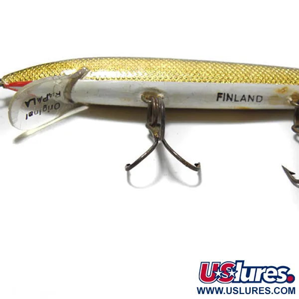 Mit einem Gewicht von 3/16 oz (5 g) präsentiert dieser klassische Balsaholz-Minnow stolz den „Finland“-Stempel auf seinem weißen Bauch, ein echtes Zeichen seiner Herkunft. Der 10 cm (4 Zoll) lange Körper ist im „Golden / Natural“-Dekor gehalten, mit einer schimmernden Goldfolien-Flanke, die in einen tiefschwarzen Rücken übergeht. Dieses spezielle Exemplar mit der Artikelnummer 0221 befindet sich in einem 4/5-Zustand, wobei Hardware und Finish sehr gut erhalten sind. Drei Drillingshaken sind über die Unterseite verteilt, was der klassischen Bestückung für diese Länge entspricht. Die klare Tauchschaufel aus Kunststoff bringt den Köder bei stetigem Einholen auf eine Tiefe von 0,9–1,5 m (3–5 ft). Ein roter Akzent im Kehlbereich setzt einen dezenten Reizpunkt direkt hinter der Öse, die Teil der für Rapala typischen, robusten durchgehenden Drahtkonstruktion ist.