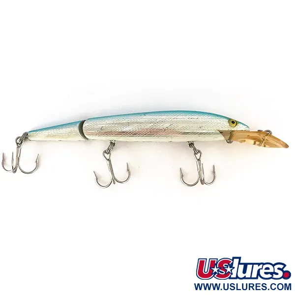 Silber-blaue Schuppenmuster bedecken die Flanken dieses Exemplars und reflektieren das Licht mit einem klassischen Metallglanz, der charakteristisch für Vintage-Angelgeräte aus den USA ist. Der Rebel Fastrac mit dem Produktcode 7843 verfügt über eine Gliederkonstruktion, die sowohl beim Werfen als auch beim Schleppfischen für eine markante mechanische Unterbrechung im Profil sorgt. Er wiegt 12,5 g (2/5 oz) und ist 12 cm (4 3/4") lang, was ihm eine beachtliche Präsenz unter Wasser verleiht. Die übergroße, transparente Tauchschaufel ist speziell für Tiefen zwischen 1,5 und 4 m (5 - 13 ft) ausgelegt. Dieser Köder befindet sich in einem 5/5-Zustand und präsentiert sich hervorragend mit originaler Hardware und intakten, scharfen Drillingen. Hergestellt in den USA, behält er die klassischen gelben Augen und einen sauberen Übergang vom leuchtend blauen Rücken zu den silbern geschuppten Seiten bei – eine Farbkombination, die häufig wegen ihrer Effektivität bei wechselnden Lichtverhältnissen gewählt wird.