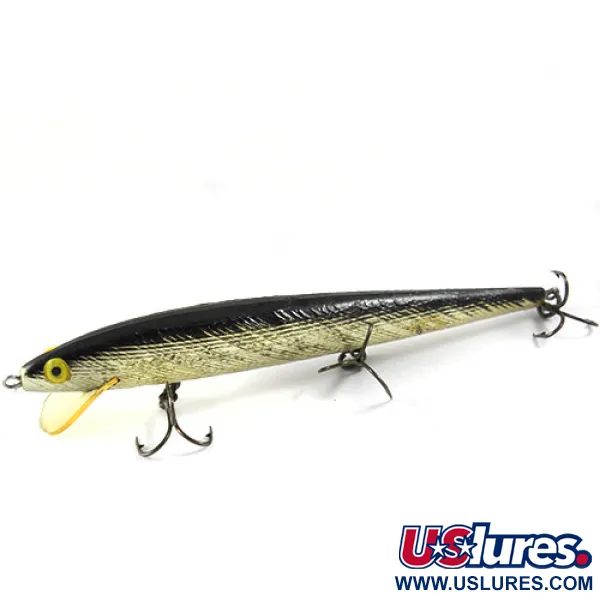 Ein tiefschwarzer Rücken geht bei diesem Rebel Floater in silberfarbene Schuppen über – ein klassisches Design für jeden Sammler amerikanischer Vintage-Köder. Dieses unter dem Produktcode 0932 geführte Exemplar zeigt das traditionelle Natural-Farbschema, akzentuiert durch markante gelbe Augen mit dunklen Pupillen. Mit einem Gewicht von 9 g (1/3 oz) und einer Länge von 11 cm (4 1/4") ist er als klassischer schwimmender Minnow für Präsentationen im Flachwasser konzipiert. Die klare Kunststoff-Tauchschaufel sitzt fest und zeigt deutlich den eingeprägten Markennamen Rebel auf der Oberfläche. Hergestellt in den USA, verfügt der Köder über drei Sätze originaler Drillingshaken, die altersbedingt leicht nachgedunkelt, aber strukturell einwandfrei sind. Mit einer Zustandsbewertung von 4/5 behält das Oberflächenfinish seinen ursprünglichen Glanz bei sehr geringen Gebrauchsspuren. Die strukturierte Formung an den Seiten simuliert ein realistisches Beutefischprofil – eine Fertigungstechnik, die in der Mitte des 20. Jahrhunderts den Ruf der Marke begründete.