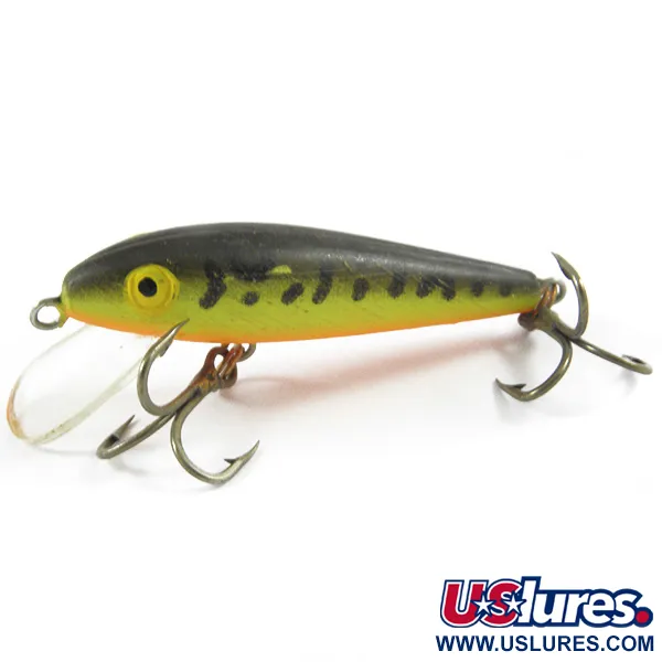 Fire Tiger-Muster wie dieses 1 1/2" (4 cm) Exemplar gehören seit langem zum Standard bei Rebel und zeichnen sich durch einen leuchtend orangefarbenen Bauch aus, der in eine limettengelbe Flanke mit markanten schwarzen Vertikalstreifen übergeht. Dieser in den USA hergestellte Kunststoffköder trägt die Artikelnummer 3267 und wiegt leichte 1/16 oz (2 g). Er wurde für flache Gewässer entwickelt und erreicht beim Werfen oder Schleppen eine Tauchtiefe von 3 ft (0,9 m). Der Zustand ist 5/5, wobei die Lackierung und die originalen Drillinge in ausgezeichnetem Zustand sind. Für die Präsentation verwenden Angler typischerweise ein gleichmäßiges Einholen oder eine Stop-and-Go-Technik. Die klare Tauchschaufel ist sauber und fest sitzend, und die gelben Augen mit schwarzen Pupillen verleihen dem Kopf ein markantes Aussehen.