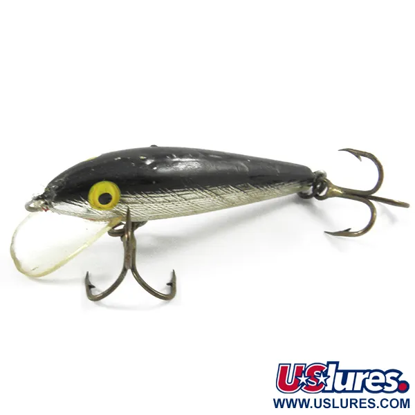 Mit einem Gewicht von feinen 1/16 oz (2g) repräsentiert dieser winzige Köder eine goldene Ära des Ultra-Light-Angelsports. Das Silver / Natural Finish auf diesem 1 1/2" (4 cm) Kunststoffkörper verfügt über einen kontrastreichen schwarzen Rücken über silbernen Flanken, detailliert mit einem feinen Kreuzschraffur-Schuppenmuster. Sein Kopf zeichnet sich durch markante gelbe Augen mit zentrierten schwarzen Pupillen und einen deutlichen roten Akzent unter dem Kinn nahe der klaren Tauchschaufel aus. Unter dem Produktcode 3268 gelistet, ist dieser Rebel Floater für eine Lauftiefe von 3 ft (0,9 m) konzipiert, was ihn zu einer vielseitigen Wahl sowohl für das Wurfangeln als auch für das Schleppfischen macht. Die Hardware ist glänzend und der Körper weist keine nennenswerten Gebrauchsspuren auf, was diesem Exemplar eine Zustandsbewertung von 5/5 einbringt. Angler bevorzugen traditionell ein gleichmäßiges Einkurbeln oder eine Stop-and-Go-Führung, um die Effektivität seines schwimmenden Designs zu maximieren.