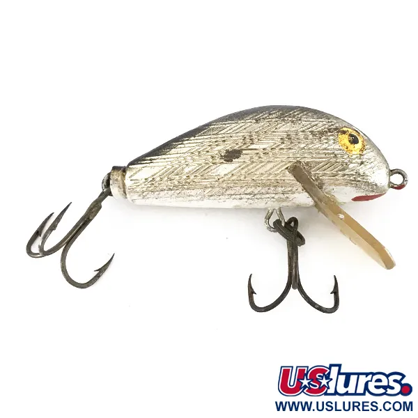 Silberne (S) Lackierung mit einem detaillierten Kreuzschraffur-Muster ziert den Körper dieses klassischen REBEL HUMPBACK, gelistet unter dem Produktcode 7837. Mit einem Gewicht von 7 g (1/4 oz) und einer Länge von 4,4 cm (1 3/4") zeichnet sich dieser in den USA hergestellte Köder durch sein markantes, gewölbtes Profil aus, dem der Humpback seinen Namen verdankt. Die klare Tauchschaufel aus Kunststoff ist für das Angeln im Flachwasser konzipiert und erreicht Tiefen von bis zu 1,2 m, ideal für Zielfische wie Barsch, Döbel oder Hecht. Auffällige gelbe Augen mit schwarzen Pupillen sind im Kopfbereich eingesetzt und dienen als klassischer Fixpunkt für Raubfische. Zur Ausstattung gehören zwei dunkel brünierte Drillingshaken, die leichte, dem Zustandswert 4/5 entsprechende Gebrauchsspuren aufweisen. Das metallische Finish glänzt weiterhin auf Schuppenmuster und Bauchseite, was die Qualität der von Rebel in dieser Ära verwendeten Materialien unterstreicht.