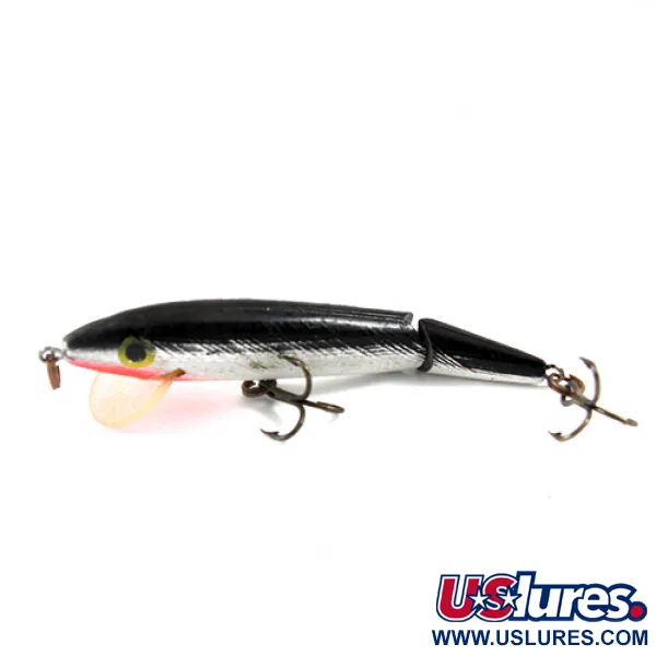 Eine Silberfolien-Oberfläche auf dem Kunststoffkörper kontrastiert mit dem tiefschwarzen Rücken und dem markanten roten Kehlfleck dieses 6,5 cm langen Modells. Dieser Rebel Jointed Minnow mit dem Produktcode 1230 ist ein klassischer, in den USA hergestellter Köder mit einem Gewicht von 3,5 g. Die klare Tauchschaufel ist für einen Tiefenbereich von 0,9 m bis 1,5 m ausgelegt und eignet sich sowohl zum Werfen als auch zum Schleppangeln mit gleichmäßigem Einholen oder Stop-and-Go-Techniken. Der zweiteilige Körper ist durch ein internes Gelenk verbunden und mit originalen Bauch- und Schwanzdrillingen ausgestattet. Das Natural-Farbmuster wird durch aufgemalte gelbe Augen und schwarze Pupillen vervollständigt. Dieses spezifische Exemplar befindet sich in einem 5/5-Zustand mit gut erhaltenen Haken und Lackierung.