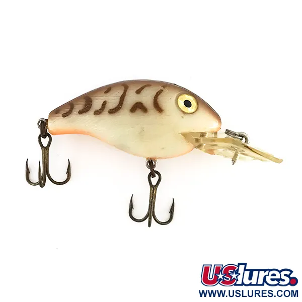Der cremefarbene Körper dieses Köders ist mit dem charakteristischen Brown Tiger-Muster versehen, das durch kräftige braune Streifen auf dem Rücken und an den Seiten besticht. Dieser Rebel Shallow Fastrac mit der Artikelnummer 8161 wurde in den USA gefertigt und wiegt vielseitige 9 g (1/3 oz). Sein Profil misst 5,5 cm (2 1/4") und ist mit markanten goldenen Prismenaugen ausgestattet, die das Licht aus verschiedenen Winkeln reflektieren. Die klare Tauchschaufel aus Kunststoff ist für eine Arbeitstiefe zwischen 0,6 und 1,8 m ausgelegt und speziell für das Angeln im Flachwasser, wie Wurfangeln oder Schleppen in Hindernisnähe, konzipiert. Die Ausstattung umfasst zwei brünierte Drillinge, und das Exemplar weist einen exzellenten Zustand von 5/5 auf. Der Bauch geht von den gestreiften Flanken in einen weichen, perlmuttfarbenen Schimmer über, wie er für Vintage-Produktionsserien von Rebel aus dieser Ära typisch ist.