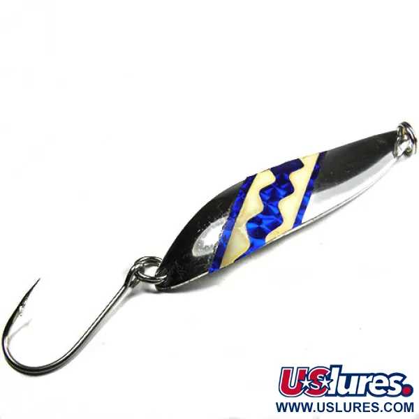 Deutlich in die polierte Nickel-Rückseite eingeprägt, bestätigt das „RED EYE LURES“-Branding die Herkunft dieses in den USA hergestellten Blinkers. Mit einem Gewicht von 1/2 Unze (14 g) und einer Länge von 3 Zoll (7,5 cm) verfügt der Metallkörper über ein auffälliges blau-cremefarbenes Zickzack-Dekor, das einen scharfen Kontrast zum reflektierenden Nickel-Finish bildet. Dieses spezielle Exemplar mit dem Produktcode 0287 ist mit einem robusten Einzelhaken ausgestattet, der an einem stabilen Sprengring befestigt ist, was ihn zu einer zuverlässigen Wahl für das Angeln an Strukturen oder das Schleppfischen im Tiefwasser macht. Die Fertigungsqualität von Eppinger zeigt sich in der Dicke des Metalls, das für seine Größe ein beachtliches Gewicht aufweist. Der Zustand dieses Köders wird mit soliden 4/5 bewertet, mit sehr gut erhaltenen Oberflächen und intakten Dekoren.