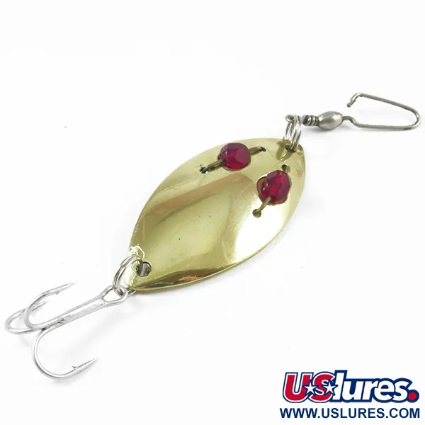 Große, lichtfangende rote facettierte Perlen sind durch den goldfarbenen Körper dieses Klassikers aus Rochester geführt und bilden einen kontrastreichen Zielpunkt für Bisse. Dieser 5,5 cm lange Blinker, bekannt als Red Eye junior mit dem Produktcode 3216, besitzt ein vielseitiges Gewicht von 11 g, das eine sehr langsame Köderführung ermöglicht – oft entscheidend, um im Sommer träge Hechte und Barsche zu reizen. Die eingeprägte Beschriftung auf der Unterseite, die auf die Herkunft von der Hofschneider Corp. in Rochester, NY hinweist, ist scharf und gut lesbar. In einem 5/5-Zustand zeigen die Metalloberflächen einen hellen, polierten Glanz, der das Licht in der Wassersäule effektiv reflektiert. Der Köder ist mit seiner Original-Hardware ausgestattet, bestehend aus einem silberfarbenen Drillingshaken und einem kopfseitig montierten Wirbel mit Drahtkarabiner. Sammler amerikanischer Angelausrüstung werden die sichere Befestigung der charakteristischen roten Augen schätzen, die diesem Modell seinen Namen und sein markantes visuelles Profil verleihen.