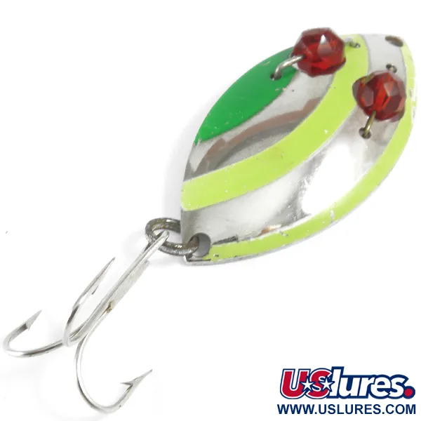 Der Name „RED EYE JUNIOR“ und das US-Patentzeichen sind deutlich in die polierte Nickel-Rückseite dieses klassischen amerikanischen Blinkers von Eppinger eingeprägt. Mit einem Gewicht von 1/2 oz (13 g) und einer Länge von 2 1/4" (5,5 cm) besticht dieses Modell durch ein markantes Farbschema in Nickel / Gelb / Grün mit lebhaften gemalten Streifen auf der Vorderseite. Das Markenzeichen des Modells 3650 sind die zwei großen, facettierten roten Glasperlen, die im Metallkörper fixiert sind und als lichtreflektierende Augen die Aufmerksamkeit der Raubfische auf sich ziehen. Die Konstruktion ist ideal zum Spinnfischen geeignet und ermöglicht eine sehr langsame Köderführung, was sie zu einer effektiven Wahl für Hechte oder große Barsche in wärmeren Gewässern macht. Die Ausstattung umfasst einen robusten Drillingshaken, der mit einem Sprengring am Ende befestigt ist. Mit seinem gut erhaltenen Finish und der klaren Lackierung weist dieser Köder einen Zustand von 4/5 auf und ist ein hervorragendes Beispiel für die US-Handwerkskunst der Jahrhundertmitte.