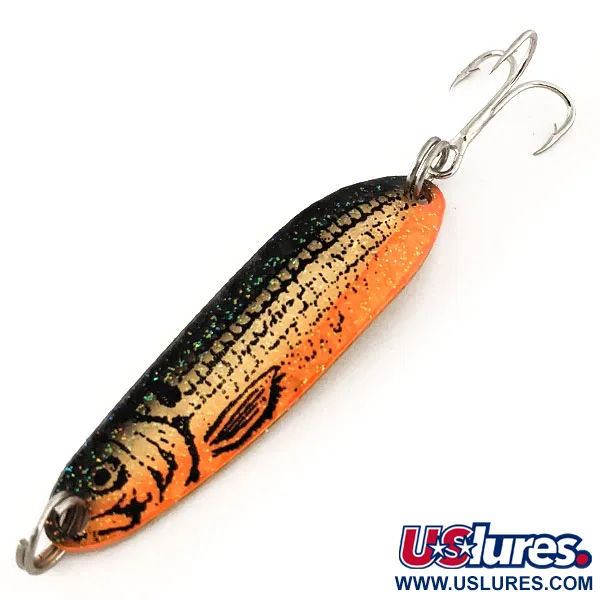 Orangefarbene und schwarze Schuppen dominieren die Oberseite dieses 9g (1/3oz) schweren Renegade Crystalina Spoon aus der Honeycomb Series. Mit einer Länge von 5,5 cm (2 1/4") zeigt der Blinker eine detaillierte Fischsilhouette mit ausgeprägter Augen- und Flossengrafik auf einer schimmernden Goldbasis. Ein dezenter grüner Glitzerschimmer auf dem schwarzen Rücken verleiht dem Profil zusätzliche Tiefe. Die Rückseite des Löffels besticht durch ein sauberes, poliertes Goldfinish mit eingestanztem Renegade Markennamen. Hergestellt in den USA unter der Artikelnummer 11690, umfasst die Hardware robuste silberfarbene Sprengringe an Kopf und Schwanz sowie einen scharfen Drilling zum Werfen oder Schleppen. Der Zustand dieses Exemplars ist mit 5/5 außergewöhnlich und zeigt den originalen Werksglanz auf den lackierten und metallischen Oberflächen. Sammler schätzen diese in Amerika hergestellte Serie besonders für den aufwendigen Schuppendruck, der die Honeycomb-Linie von Standard-Modellen abhebt.