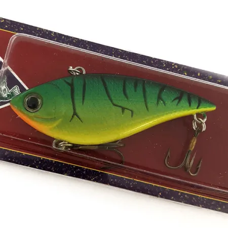 Vertikale schwarze Streifen heben sich deutlich vom leuchtenden grün-gelben Farbverlauf dieses Lipless Crankbaits ab. Dieses spezielle 14 g (1/2 oz) Modell aus der Renegade Pro Series trägt den Produktcode 12922 und ist 7 cm (2 3/4") lang. Die Konstruktion umfasst einen sinkenden Mehrkammer-Körper für interne Geräuschentwicklung, was je nach Einholgeschwindigkeit das Angeln in verschiedenen Tiefen ermöglicht. Besonders hervorzuheben sind die handbemalten Details: Der Köder verfügt über eine leuchtend orangefarbene Kehle und realistische Augen auf einem natürlichen holografischen Hintergrund. Die Ausstattung umfasst original Eagle Claw Haken. Als unbenutztes Exemplar in der Originalverpackung weist er einen Zustand von 5/5 auf. Ursprünglich in den USA hergestellt und von Profi-Anglern getestet, wurde dieser Köder für verschiedene Techniken wie Werfen und Schleppfischen auf Arten wie Hecht, Zander und Forelle entwickelt.