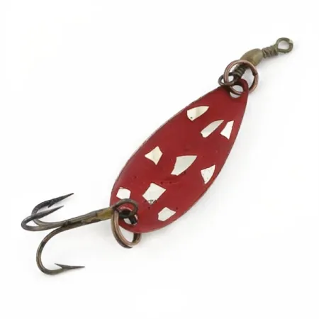 Mit einem Gewicht von feinen 1,5 g (3/64 oz) ist dieser kleine Blinker ein klassisches Stück amerikanischer Angelgeschichte von Roy Self. Mit einer Länge von 3,3 cm (1 1/4") besticht dieses Exemplar durch eine auffällige rote Lackierung auf der Vorderseite, die mit unregelmäßigen Nickelsplittern versehen ist und so Lichtreflexe in alle Richtungen erzeugt. Die Rückseite weist ein sauberes, poliertes Nickel-Finish auf, in das der Herstellername und die Modellnummer deutlich eingeprägt sind. Dieser spezielle Roy Self #1 mit dem Produktcode 23911 ist mit der Original-Hardware ausgestattet, darunter ein kleiner messingfarbener Tönnenwirbel und ein brünierter Drillingshaken. Solche kleinen Größen in einem so gut erhaltenen Zustand zu finden, ist ein Highlight für jede Sammlung, da der Lack dieser Köder oft unter Lagerungsspuren oder Stößen litt. Der Zustand dieses Exemplars wird mit 5/5 bewertet und weist eine bemerkenswert gut erhaltene Oberfläche sowohl auf der lackierten als auch auf der metallischen Seite auf. Seine Leichtbauweise war ursprünglich für das Ultralight-Spinnfischen oder Schleppen auf Forellen und Barschartige gedacht. Die Sprengringe und der Wirbel sind nach wie vor stabil und bereit für die Vitrine.