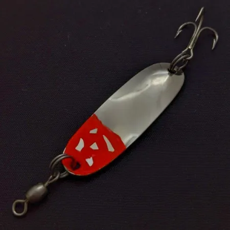 Mit einer Länge von 4,5 cm (1 3/4") verfügt dieser Blinker über ein klassisches, längliches Profil, das sich ideal für die Jagd auf Forellen oder Barschartige mit leichtem Gerät eignet. Die gestanzte Vernickelung der oberen Hälfte sorgt für stetige Lichtreflexe und kontrastiert mit dem unteren roten Bereich, der weiße Details aufweist. Mit einem Gewicht von 4 g (1/8 oz) ist der Roy Self #2 perfekt ausbalanciert, um in enge Lücken geworfen oder entlang von Krautkanten geführt zu werden. Eine dezent konturierte Oberfläche des Metallkörpers hilft dabei, Lichtreflexionen zu brechen – ein spezifisches Merkmal dieser Roy Self Designs. Unter der Artikelnummer 24587 gelistet, befindet sich dieses Exemplar in einem 5/5-Zustand mit einem sauberen Finish und klaren Farbübergängen. Ein vormontierter Tönnchenwirbel am Kopf verhindert den Schnurdrall beim Einholen durch die Wassersäule.