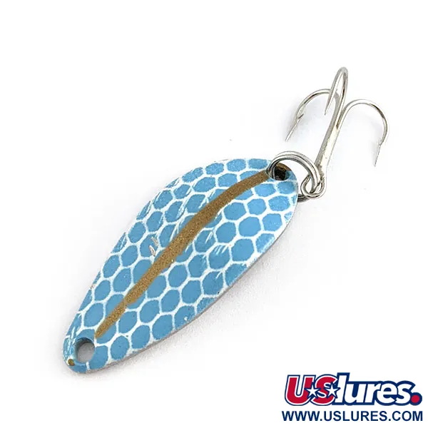 Die Vernickelung auf der Rückseite dieses 3 cm (1 1/4") Blinkers sorgt für starke Lichtreflexe und einen hohen Kontrast zum feinen blau-weißen Wabenmuster auf der gewölbten Vorderseite. Dieses blaue Dekor zeigt ein weißes Schuppenmuster, das durch einen auffälligen goldenen Längsstreifen in der Mitte des Blattes ergänzt wird. Der tropfenförmige Körper ist auf der Rückseite deutlich mit dem Namen „LITTLE CLEO“ geprägt und über einen stabilen Sprengring mit einem silberfarbenen Drilling verbunden. Der Köder der Marke Seneca stammt aus den USA und wird unter dem Produktcode 21866 geführt. Mit einem Gewicht von 5 g (3/16 oz) ist die Metallkonstruktion ideal für präzise Würfe ausbalanciert. Da der Artikel unbenutzt ist, befinden sich die reflektierende Nickeloberfläche und das aufgedruckte Schuppenmuster in einem makellosen Zustand.