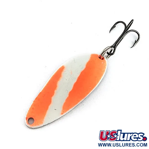 Kräftige orangefarbene Diagonalstreifen unterbrechen das reinweiße Finish dieses 7g (1/4oz) Blinkers und sorgen für ein kontrastreiches Muster, das unter verschiedenen Wasserbedingungen gut sichtbar ist. Mit der Artikelnummer 22172 ist dieser Seneca Little Cleo ein klassisches Beispiel für in den USA gefertigtes Angelzubehör. Die silberfarbene Rückseite ist tief mit dem Namen „LITTLE CLEO WIGL-LURE“ und der Herstellerangabe „A SENECA LURE“ geprägt. Mit einer Länge von 4 cm (1 1/2") befindet sich der Blinker in einem exzellenten Zustand (5/5) und weist sowohl auf der lackierten als auch auf der metallischen Oberfläche ein glattes, gut erhaltenes Finish auf. Die Ausstattung umfasst einen dunklen Drillingshaken, der über einen robusten Sprengring am breiten Ende des Köders montiert ist. Der tropfenförmige Metallkörper ist für weite Würfe oder zum Schleppen konzipiert und verfügt über eine Einhängeöse an der Spitze für einen Snap oder ein Vorfach.