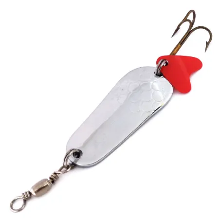 Eine klassische gehämmerte Nickel-Oberfläche definiert die Vorderseite dieses Blinker-Klassikers aus der Mitte des Jahrhunderts, der so konzipiert wurde, dass er das Licht in gebrochenen Mustern unter der Wasseroberfläche reflektiert. Mit einem Gewicht von 16g (3/5oz) und einer Länge von 4,7cm (1 3/4") verfügt der Köder über ein markantes Tropfenprofil, das auf der glatten Rückseite mit dem ikonischen „Shakespeare“-Schriftzug geprägt ist. Hergestellt von der William Shakespeare Co. aus Kalamazoo, Michigan (Produktcode 10213), repräsentiert dieses Stück das Erbe des Unternehmens, das 1897 vom Angel-Visionär William Shakespeare gegründet wurde. Das Exemplar befindet sich in einem 5/5-Zustand und weist einen brillanten Metallglanz sowie saubere Kleinteile auf. Für zusätzlichen optischen Reiz ist ein leuchtend rotes, herzförmiges Lockblättchen aus Kunststoff am hinteren Sprengring neben einem scharfen, brünierten Drillingshaken angebracht. Ein robuster Tönnchenwirbel ist werkseitig an der Nase montiert, sodass der Köder sofort für die Verbindung mit einem Stahl- oder Monofilvorfach bereit ist.
