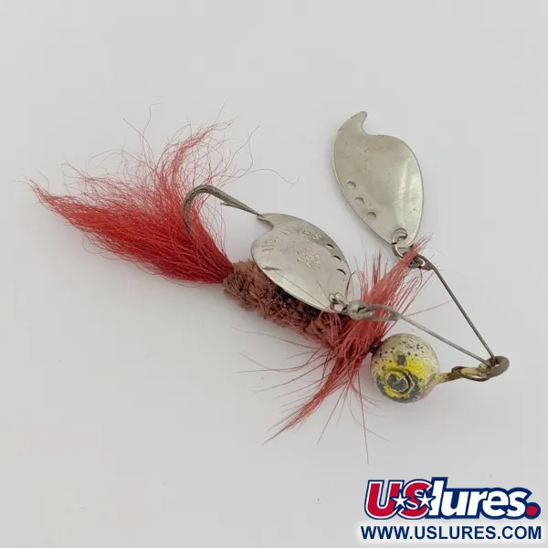 Direkt in die vernickelten Spinnerblätter sind die Markierungen „SHANNON“ und „PAT PEND USA“ eingeprägt, ein Markenzeichen des Jamison-Designs aus den 1920er bis 40er Jahren. Dieser 5 cm lange Shannon Twin Spinner kombiniert Doppelblätter mit einem leuchtend roten Federhechel-Schwanz und einem strukturierten braunen Chenille-Körper. Der 10 g schwere Bleikopf zeigt mit seiner gealterten gelb-schwarzen Lackierung echten Charakter (Zustand 4/5). Der Drahtrahmen positioniert die Spinner über dem Körper, ideal für Würfe in dichtes Kraut oder Seerosenfelder. Die roten Federn sind bemerkenswert füllig und kontrastieren scharf mit dem Nickel-Finish der Blätter. Modell #24491 steht für frühe Innovationen bei krautfreien Ködern.