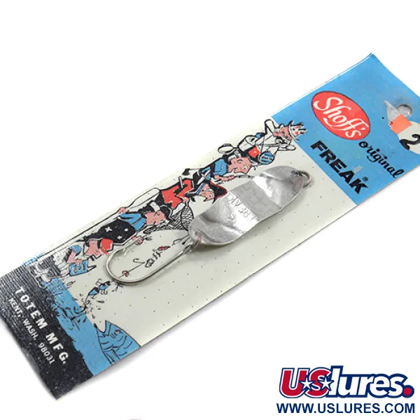 Auf dem reflektierenden silbernen Blatt ist die Nummer „2“ neben dem Modellnamen „FREAK“ deutlich eingestempelt, was diesen klassischen Blinker aus dem pazifischen Nordwesten kennzeichnet. Hergestellt unter der Marke Shoff's und vertrieben von Totem Mfg. in Kent, Washington, zeigt dieser 5,5 cm (2 1/4") lange Köder die hochwertige Handwerkskunst klassischer amerikanischer Angelausrüstung. Die Versilberung ist außergewöhnlich sauber, da der Artikel unbenutzt ist und seinen ursprünglichen Glanz ohne Alters- oder Lagerspuren bewahrt hat. Mit einem Gewicht von 12 g (2/5 oz) ist das Blatt mit einem robusten Einzelhaken ausgestattet, der für sichere Anhiebe ausgelegt ist. Die originale Verkaufsverpackung zeigt charmante Illustrationen von Anglern aus der Mitte des Jahrhunderts, die dem Produktcode 1885 eine historische Note verleihen. Seine markante Form und die strukturierte Oberfläche sind Markenzeichen eines Designs, das für das Spinnfischen oder Schleppangeln unter verschiedenen Wasserbedingungen entwickelt wurde.