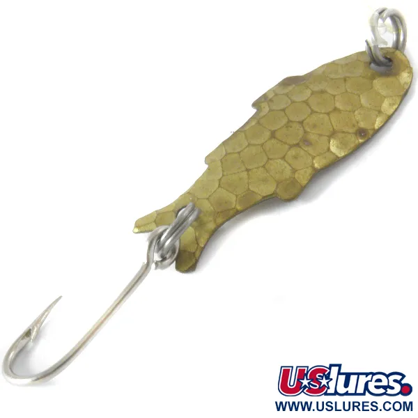 Die gehämmerte Messingoberfläche verleiht diesem Vintage-Blinker eine markante Schuppenoptik, die in klarem Wasser ein kleines Beutefischchen imitiert. Mit einer Länge von 3 cm (1 1/4") und einem Gewicht von 1,1 g (1/32 oz) ist der Shoff's Triple Teazer ein Klassiker im Ultra-Light-Bereich aus den USA. Dieses Exemplar mit der Produktnummer 4099 befindet sich in einem Zustand von 4/5, weist saubere Oberflächen auf und besitzt deutlich geprägte Flossen entlang der Ränder des fischförmigen Körpers. Er ist mit silberfarbenen Sprengringen an Kopf und Schwanz ausgestattet, kombiniert mit einem einzelnen scharfen Haken. Die Silhouette ähnelt einer kleinen Elritze, komplett mit einem verjüngten Schwanz und einem etwas breiteren Kopfbereich. Das gehämmerte Finish auf der Vorderseite sorgt für vielfältige Lichtreflexionen, während die konkave Rückseite glatt gehalten ist, wodurch die ursprüngliche Messingfarbe deutlich zur Geltung kommt.