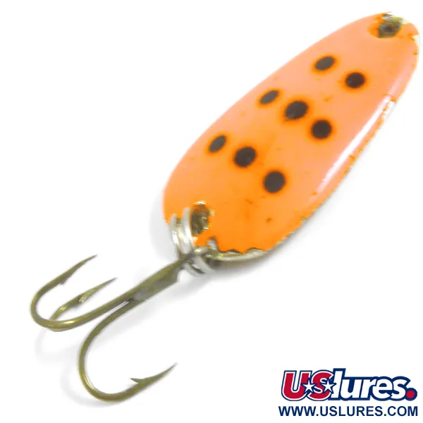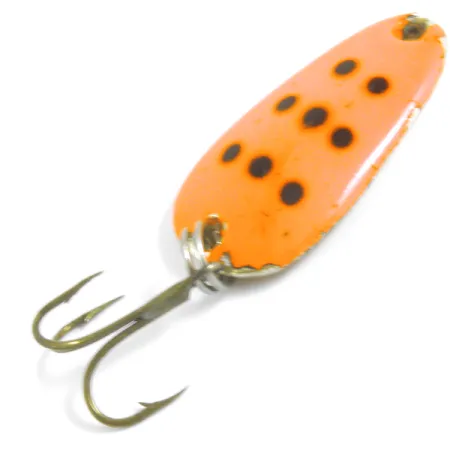 Auf der goldfarbenen Rückseite deutlich eingeprägt, kennzeichnet die Markierung 'SØLV-KROKEN NORWAY' diesen 3 cm langen Blinker als ein klassisches Beispiel skandinavischer Handwerkskunst. Mit einem Gewicht von 7 g präsentiert der Köder ein kontrastreiches Rot-Gold-Muster, wobei die Vorderseite in einem lebhaften Orangeton gehalten ist, der durch sieben dunkle Punkte unterbrochen wird. Die Montage besteht aus einem einzelnen Drilling, der durch einen Sprengring am Ende gesichert ist, ideal für verschiedene Wurf- und Schleppangeltechniken. Dieses spezielle Exemplar mit dem Produktcode 4437 weist einen Zustand von 4/5 auf, mit nur geringfügigen Oberflächenabnutzungen, die seinem Alter entsprechen, während die Struktur makellos bleibt. Die norwegische Herkunft der Marke Sølvkroken zeigt sich in der massiven Metallbauweise und der präzisen Prägung auf der polierten Rückseite.