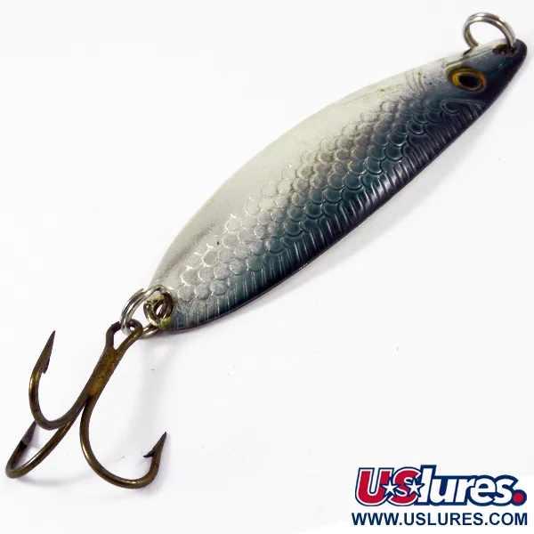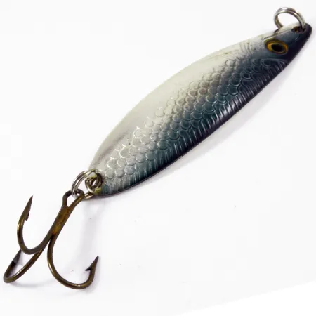 Ein klassisches Heringsschuppen-Muster ziert die Oberseite dieses 7,5 cm (3") langen Blinkers, das von einem tiefblau-grauen Rücken in einen schimmernden silber-weißen Bauch übergeht. Dieser aus Norwegen stammende Sølvkroken Storlaksen, gekennzeichnet durch den Produktcode 3356, ist ein Klassiker im skandinavischen Lachs- und Meerforellen-Sortiment. Mit einem Gewicht von 10 g (1/3 oz) ist der längliche, leicht geschwungene Körper auf der Rückseite deutlich mit dem Markennamen und „Norway“ geprägt. Die Ausstattung ist in Bestform und umfasst zwei stabile Sprengringe sowie einen bronierten Drillingshaken, der sich sowohl zum Werfen als auch für leichtes Schleppfischen eignet. Ein aufgemaltes gelbes Auge mit schwarzer Pupille am Kopf dient den Raubfischen als naturgetreuer Zielpunkt. Dieses Exemplar befindet sich in einem 5/5-Zustand und hat seinen polierten Metallglanz bewahrt. Auf der inneren Silberseite befindet sich ein kleiner grüner Punkt aus der Zeit in der Sammlung eines Vorbesitzers.