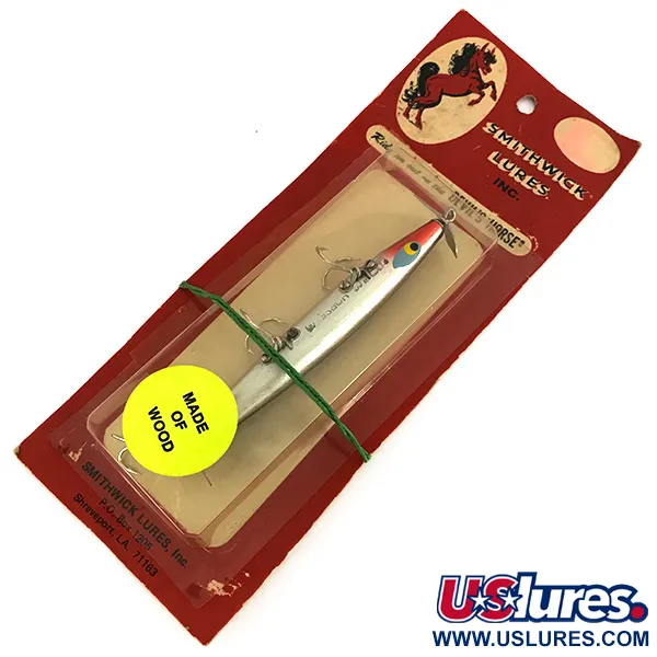 Ein leuchtend gelber Aufkleber mit der Aufschrift „MADE OF WOOD“ kennzeichnet diese Smithwick Devil's Horse als Holzköder im Gegensatz zu den späteren Kunststoffmodellen. Unter dem Produktcode 7690 gelistet, weist der Köder die Farbe Nickel mit einem klassischen roten Kopf und gelb-schwarzen Augen auf. Dieses 4 1/2" (11,5 cm) lange Exemplar wiegt 1/3 oz (9 g) und ist als Oberflächenköder für eine Tauchtiefe von 0 ft (0 m) konzipiert. Der Köder ist unbenutzt und befindet sich in der Originalverpackung, wobei sich der klare Blister von der roten Karte gelöst hat und durch ein grünes Band gesichert ist. Auf der Rückseite der F-131-Verpackung finden sich technische Einstellhinweise zur Justierung des Leitdrahts für einen geraden Lauf. Die Ausstattung umfasst einen Frontpropeller für Oberflächenturbulenzen und Drillinge, die direkt im Holzkörper montiert sind. Dieses Modell stammt aus Shreveport, LA, und repräsentiert die traditionelle Handwerkskunst von Smithwick vor den modernen Produktionsänderungen.