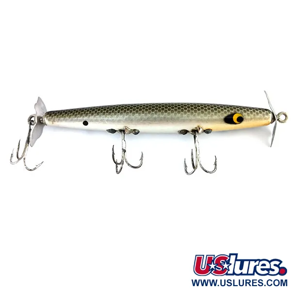 Ein feines Netzschuppenmuster ziert den grünlich-silbernen Rücken dieses hölzernen Oberflächenköders, der fließend in einen blassen, cremefarbenen Bauch übergeht. Mit einer Länge von 11,5 cm (4 1/2") spiegelt der schlanke Holzkörper die Qualität wider, die man von einem in den USA hergestellten Smithwick Devil's Horse unter dem Produktcode 9692 erwartet. Die Hardware ist glänzend und besteht aus zwei Metallpropellern für maximale Oberflächenunruhe in einer Tiefe von 0 m sowie drei scharfen Drillingen. Mit einem Gewicht von 9 g (1/3 oz) ist der Köder speziell für präzise Würfe ausbalanciert, während er eine hohe Auftriebskraft behält. Handbemalte gelbe Augen mit großen schwarzen Pupillen setzen einen Fokuspunkt auf dem Schuppenfinish. Dieses Exemplar befindet sich in einem Zustand von 5/5, mit einem sauberen Finish und gut erhaltenen Metallpropellern. Ein einzelner dunkler Punkt auf der hinteren Körperseite ist ein markantes Merkmal dieser Vintage-Serie.