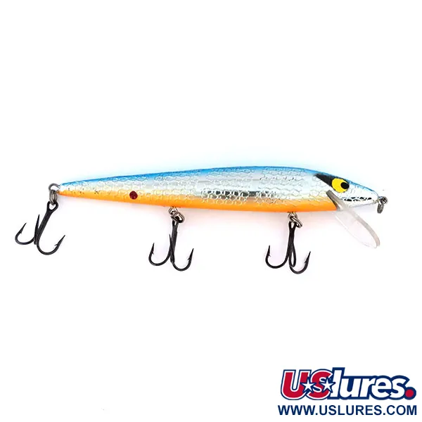 Gleißende Silberschuppen bedecken die Flanken dieses 12 cm langen Jerkbaits, die in ein kräftiges Blau entlang des Rückens und einen leuchtend orangefarbenen Bauch übergehen. Bekannt unter dem Produktcode 11035, ist dieser Smithwick Suspending Rattlin’ Rogue 12 ein klassisches Beispiel für amerikanische Köderkunst, hergestellt in den USA. Der Kopf wird durch ein markantes gelbes Auge in einer schwarzen, tränenförmigen Markierung betont, ein typisches optisches Merkmal dieses Modells. Ein kleiner, gezielter roter Punkt befindet sich knapp oberhalb des untersten Punktes in der Nähe des Schwanzhakens und setzt einen dezenten Akzent auf dem Metallic-Finish. Als Schwebemodell (Suspending) ist dieser 12g schwere Köder so konzipiert, dass er bei einem Einholstopp bewegungslos im Wasser stehen bleibt. Die interne Rasselkammer sorgt für ein spezifisches akustisches Profil während der Führung. Je nach Technik ermöglicht die klare Kunststoffschaufel eine Tauchtiefe von 0,3 m bis 2 m beim Werfen, während der Köder beim Schleppangeln Tiefen von 3 m bis 4 m erreichen kann. Dieses Exemplar befindet sich in einem 5/5-Zustand mit sauberer Lackierung und drei scharfen Drillingshaken an originalen Sprengringen.