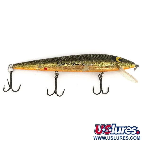 Goldfarbene Schuppen im Avocado Shad-Muster zieren den schlanken Körper dieses klassischen Smithwick Suspending Rattlin’ Rogue. Mit einer Länge von 11,5 cm (4 1/2") ist der Köder mit drei Drillingen ausgestattet und trägt den für den Produktcode 7441 typischen Aufdruck „SUSPENDING ROGUE“ auf dem Bauch. Das Gewicht von 10 g (1/3 oz) ist für eine schwebende (suspending) Präsentation perfekt ausbalanciert, wodurch er beim Werfen Tiefen von 0,3 m bis 2,0 m (1 ft - 6,5 ft) und beim Schleppen 3,0 m bis 4,0 m (10 ft - 13 ft) erreicht. Dieses Exemplar befindet sich im Zustand 4/5 und weist leichte Gebrauchsspuren an den Schuppen und der klaren Tauchschaufel auf. Eine interne Rassel sorgt für akustische Reize beim Einholen und vervollständigt das technische Profil dieses klassischen amerikanischen Jerkbaits.