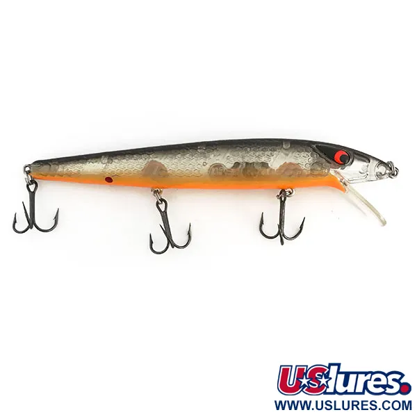 Silberne und orangefarbene Akzente zieren die durchscheinenden, geschuppten Flanken dieses Smithwick Suspending Rattlin’ Rogue, ein bemerkenswertes Design aus der US-Produktion. Dieses Modell mit dem Produktcode 9037 wiegt 10 g (1/3 oz), ist 11,5 cm (4 1/2") lang und verfügt über eine interne Rasselkammer, die beim Einholen akustische Signale aussendet. Als schwebendes Modell (Suspending) hält es bei Pausen präzise die Tiefe und erreicht beim Werfen 0,3 m - 2 m (1 ft - 6,5 ft) oder beim Schleppen 3 m - 4 m (10 ft - 13 ft). Das optische Profil besticht durch einen dunklen Rücken, rot-schwarze Augen und einen leuchtend orangefarbenen Bauch, der einen kontrastreichen Zielpunkt für von unten raubende Fische bietet. Drei scharfe Drillingshaken sind an robusten Sprengringen befestigt. Der Köder weist keine Gebrauchsspuren auf und erhält eine Zustandsbewertung von 5/5. Dieser Jerkbait ist ein Klassiker für technische Präsentationen, bei denen ein stationärer Halt in der Wassersäule entscheidend ist.