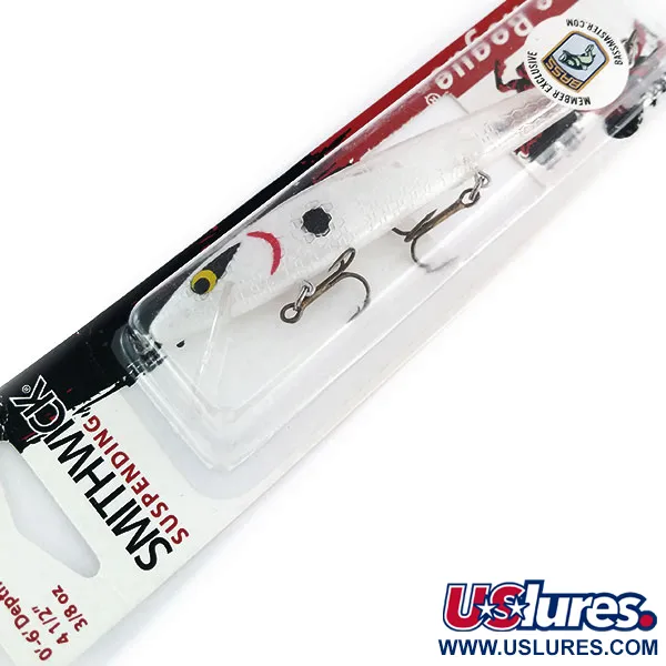 Transparente weiße Schuppen kombiniert mit einem kräftigen roten Kiemenstrich und einem markanten schwarzen Seitenfleck definieren das Design dieses Smithwick Suspending Rattlin’ Rogue. Mit einer Länge von 11,4 cm und einem Gewicht von 10,6 g ist dieser in den USA hergestellte Jerkbait unter dem Produktcode 9808 gelistet. Dieses Exemplar ist unbenutzt und behält sein originales Werksfinish sowie die scharfen, bronzierten Drillingshaken. Als "Pro Rogue" konzipiert, ist der Köder perfekt ausbalanciert, um schwebend (suspending) in der Wassersäule zu verharren. Er erreicht beim Werfen Tiefen von 0–1,8 m und beim Schleppen bis zu 3,0–4,0 m. Das interne Rasselsystem fügt der Präsentation ein akustisches Element hinzu. Die klare Tauchschaufel ist in den Körper integriert, um die Tiefe bei konstantem Einholen oder in Pausen stabil zu halten.