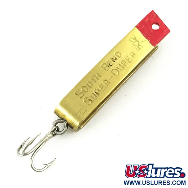 Auf dem U-förmigen Messingkörper ist die Prägung „SOUTH BEND SUPER-DUPER 502“ deutlich sichtbar, die dieses 2,5 g schwere Modell kennzeichnet. Mit einer Länge von 3 cm weist der Köder das klassische Farbschema Gold / Rot auf, wobei die rote Lackierung an der Spitze der Schnuröse aufgebracht ist. Diese in den USA hergestellte Rarität, gelistet unter dem Produktcode 5663, nutzt die charakteristische gefaltete Metallkonstruktion, die South Bends Innovationskraft in den USA prägte. Auf der gegenüberliegenden Seite der Markenprägung sorgt ein facettierter Goldeinsatz für eine geometrische, lichtreflektierende Oberfläche, die den polierten Rahmen ergänzt. Die Montage besteht aus einem einzelnen silberfarbenen Drilling, der mit einem Sprengring an der Biegung des Metalls befestigt ist. Mit einer Zustandsbewertung von 5/5 besticht der Köder durch ein sehr gepflegtes Erscheinungsbild mit kräftigen Farben und glänzenden Metalloberflächen. Seine einzigartige Bauweise vereint die Laufeigenschaften von Blinker und Spinner und eignet sich sowohl zum Spinnfischen als auch zum Schleppen.