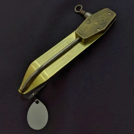 Eine Prägung auf dem goldfarbenen Metallkörper identifiziert dieses Exemplar als TRIX-ORENO NO. 596, einen Vintage-Fliegenrutenköder, der in den 1940er Jahren von South Bend hergestellt wurde. Mit einem Gewicht von 21 g (3/4 oz) und einer Länge von 8 cm (3 1/4") ermöglicht seine spezielle Konstruktion ein verführerisches Flattern wie ein Insekt, wenn er durch die Wassersäule absinkt. Dieses spezielle Modell ist mit einem Einzelhaken ausgestattet, an dessen Öhr ein kleines silbernes Spinnerblatt in Tropfenform für zusätzliche Reizwirkung sorgt – ideal, um Fische in tiefen, dunklen Gumpen anzusprechen. Die Bauweise umfasst einen Draht-Krautschutz sowie einen integrierten Tönnchenwirbel am Befestigungspunkt für eine stabile Schnurführung. Mit einer Bewertung von 4/5 behält die Metalloberfläche eine klare, gut lesbare Prägung und einen kräftigen Glanz. South Bend hat dieses Modell so entwickelt, dass es leicht genug für den Einsatz an der Fliegenrute ist, um durch subtile Bewegungen der Rutenspitze die Schwimmbewegungen eines kleinen Beutefisches zu imitieren.