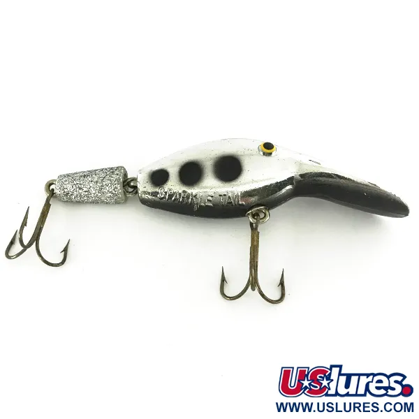 Die Versilberung verleiht diesem 8 cm langen Gliederwobbler eine klassische Reflexion, die das Licht aus jedem Winkel einfängt. Unter der Artikelnummer 7223 geführt, zeichnet sich dieser Eppinger Sparkle Tail durch einen markanten, glitzerbeschichteten Heckbereich aus, der ihn von herkömmlichen Hartködern seiner Ära abhebt. Der Körper wird durch drei kräftige schwarze Punkte an der Seite betont, die direkt über dem eingestanzten Modellnamen „SPARKLE TAIL“ positioniert sind. Mit einem Gewicht von 10 g besteht der Köder aus zwei Segmenten, die durch ein robustes Metallgelenk verbunden sind, kombiniert mit einer Tauchschaufel für eine schwimmend-eintauchende Präsentation. Das Silberfinish ist bemerkenswert gut erhalten (Zustand 5/5), obwohl die originalen Bauch- und Schwanzdrillinge die charakteristische Nachdunkelung von Vintage-Stahl aufweisen. Die gelben Augen mit kleinen schwarzen Pupillen sitzen markant im vorderen Bereich und bieten einen fixen Zielpunkt auf dem metallischen Profil. Dieser in den USA hergestellte Köder nutzt ein auftriebsbasiertes Design, das für Wurf- oder Schlepptechniken konzipiert wurde.