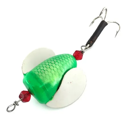 Eine lebhafte grüne Lackierung mit einem detaillierten Schuppenmuster ziert den Körper dieses 11 g (2/5 oz) schweren Lockköders. Dieser Spin-n-Glo mit dem Luhr Jensen Produktcode 8856 hat eine Länge von 10 cm (4") und weist die traditionelle Flügelform auf, die typisch für die US-Produktion der Marke ist. Zwei steife weiße Flügel sind am Mittelstück montiert, das von facettierten roten Perlen auf dem Innendraht flankiert wird. Die Montage umfasst einen robusten Drillingshaken, der mit einer schwarzen Hülse gesichert ist. Dieses Exemplar befindet sich in einem 5/5-Zustand und weist eine hervorragende Erhaltung des grünen Schuppenfinishs sowie der strukturellen Integrität der Flügel auf.