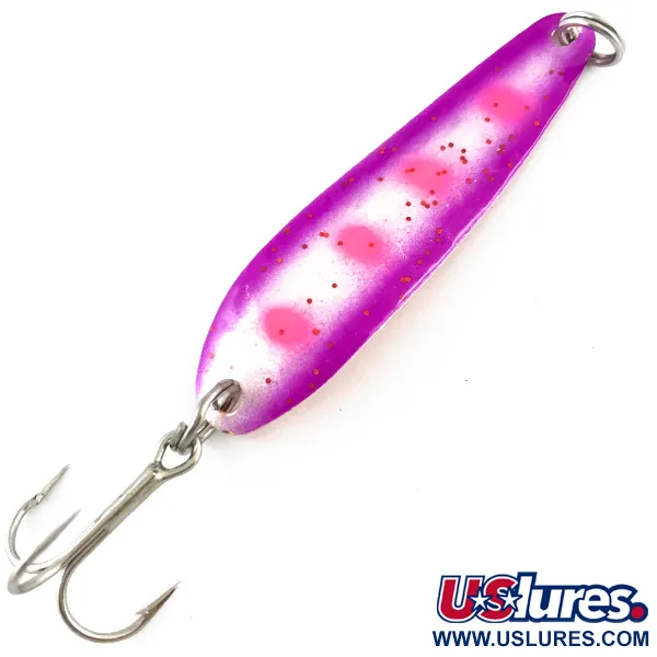 Dieser 5g (3/16oz) Schlepplöffel von Advance Tackle besticht durch sein klassisches Finish aus gehämmertem Kupfer auf der Rückseite. Die Vorderseite weist einen Übergang von kräftigen lila Rändern zu einer strahlend weißen Mitte auf, akzentuiert durch vier markante rosa Punkte und feinen roten Glitzerstaub. Mit einer Länge von 5,5 cm (2 1/4") wurde dieser in den USA hergestellte Stinger Scorpio (Produktcode 4282) direkt mit seinem Namen und der Herkunft Michigan in die wabenförmige Kupferbeschichtung geprägt. Dieses Exemplar befindet sich im Zustand 5/5 und bewahrt seinen vollen Glanz auf der metallischen Rückseite sowie eine scharfe Definition auf der lackierten Seite. Die Hardware besteht aus einem scharfen Drillingshaken und doppelten Sprengringen, optimiert für Trolling-Montagen, bei denen der Kontrast zwischen der gut sichtbaren Lackierung und dem warmen Kupferreflex am effektivsten ist. Das schmale, längliche Profil ist charakteristisch für das Trolling-Design der Großen Seen aus dem späten 20. Jahrhundert, das gezielt auf Forellen und Lachse ausgerichtet ist.