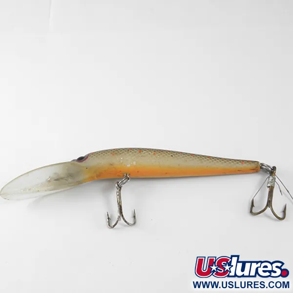 Dieses im klassischen oliv-goldenen Schuppenmuster mit feinen orangen Punkten gehaltene Exemplar zeigt die Handwerkskunst eines in den USA hergestellten Storm-Köders. Der unter dem Produktcode 1228 identifizierte Deep Jr Thunder Stick misst genau 10 cm (4") und wiegt 9 g (1/3 oz). Die lange, klare Tauchschaufel ist für Tiefen zwischen 2 m und 4 m (6,5 ft bis 13 ft) ausgelegt, was ihn zu einer zuverlässigen Wahl für das Angeln auf Zander in tieferem Wasser macht. Sein schlankes Profil wird durch markante rote Augen und originale Drillingshaken ergänzt. Der Zustand wird mit 4/5 bewertet, wobei er nur leichte Gebrauchsspuren aufweist, während das lebendige Finish und die Hardware erhalten geblieben sind. Angler greifen oft zu diesem schwimmenden Minnow-Design, wenn sie über Strukturen werfen oder schleppen, wo eine Präsentation im Tiefwasser entscheidend ist.