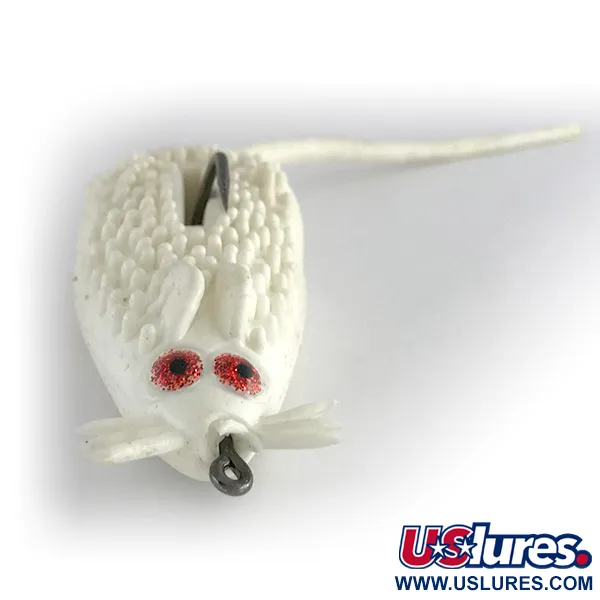 Ein strahlend weißes Finish ziert den strukturierten, genoppten Körper dieses klassischen Oberflächen-Nagers, wodurch er sich deutlich von dichter Vegetation abhebt. Dieser Strike King King Rat stammt aus den USA und wird unter dem Produktcode 8065 geführt. Er repräsentiert eine klassische Ära hängerfreier Topwater-Köder für das Angeln in dichtem Bewuchs. Der Weichköber verfügt über einen einzelnen, nach oben gerichteten Haken, der durch eine tiefe Nut am Rücken geschützt ist, um Hänger zu vermeiden. Funkelnde rote Augen bieten einen markanten Zielpunkt, während die integrierten Barthaare und der lange Schwanz das Profil abrunden. Mit 1/2oz (14g) und 2 1/4" (6cm) ist das Verhältnis von Gewicht zu Größe ideal für Würfe in Seerosenfelder ausgelegt, wo sich Hechte und Barsche oft verstecken. Dieses Exemplar befindet sich in einem hervorragenden Zustand (Bewertung 5/5), wobei die weiße Färbung und die flexiblen Komponenten bemerkenswert gut erhalten sind. Die Öse für die Schnurbefestigung sitzt direkt an der Nase für eine gerade, gleichmäßige Führung durch Kraut und Schlamm.